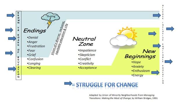 A third reason for looking back can be summed up in the picture above (click for larger view). It is a simple model by William Bridges for understanding complex change. The goal of our change was quality education for all regardless or race and class. Desegregation was one strategy for reaching that goal. And “busing” was a tactic that tried to push Boston through its resistance to that strategy.